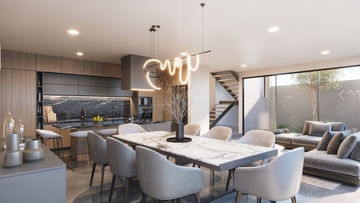 El comedor se ubica estratégicamente junto a ventanales de piso a techo, permitiendo que la luz natural bañe el espacio durante todo el día. Su diseño permite alojar una mesa de gran formato, ideal para reuniones formales, mientras que los acabados neutros y la iluminación puntual elevan la experiencia sensorial.